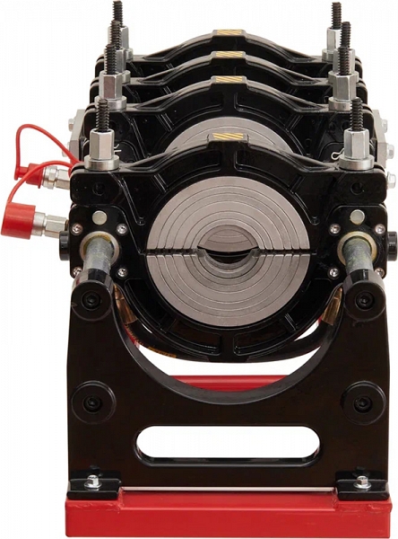 - Центраторо с гидравлическим приводом и 4-мя прочными широкими зажимами, один из которых легко может быть удален для облегчения сварки полимерных фитингов с трубами (тройники, крестовины, отводы), имеет большой запас прочности за счет качественного сплава и ребер жесткости, что позволяет сваривать полимерные трубы с любым показателем SDR